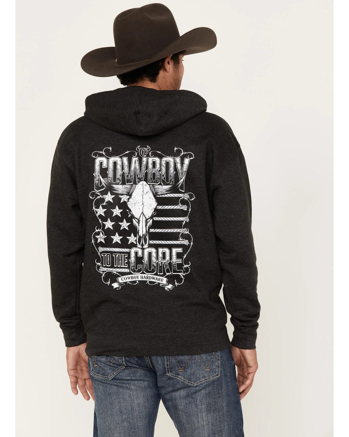 - Large “Cowboy To The Core” with stars, rope, & steerhead graphic on back