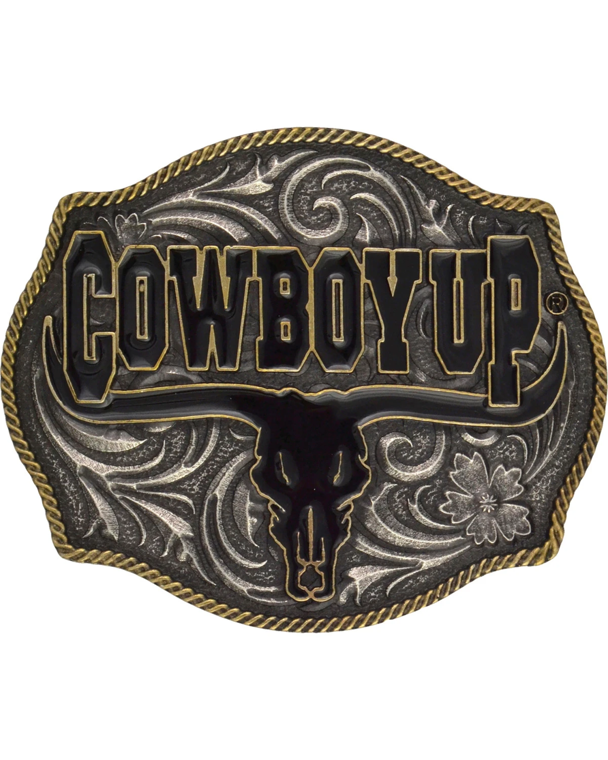 Spiff up your cowboy duds with a Montana Silversmiths belt buckle! Quality nickel and brass plated buckle design with black inlay to highlight details. Traditional western rope edge. Men’s belt buckle measures 3 1/4″ x 4″.
