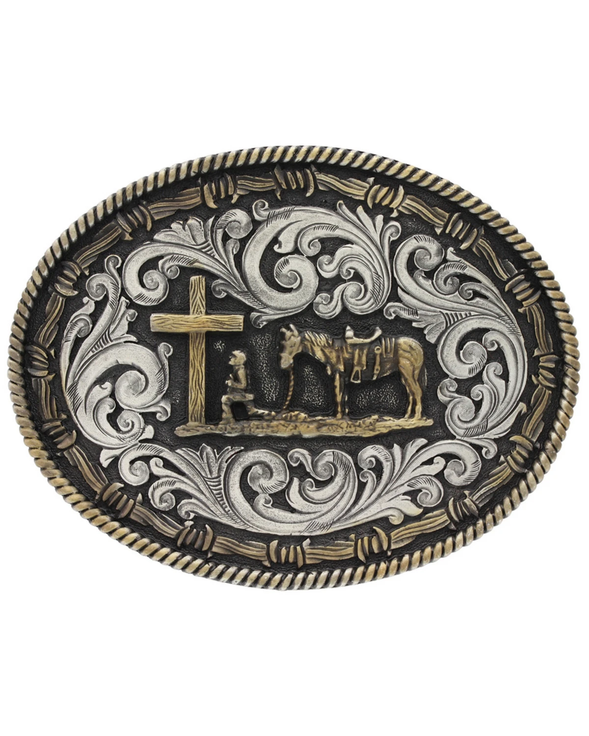 - Features a highly detailed traditional gold tone christian cowboy figure surrounded by classic silver tone filigree edged with gold tone barbed wire and twisted rope